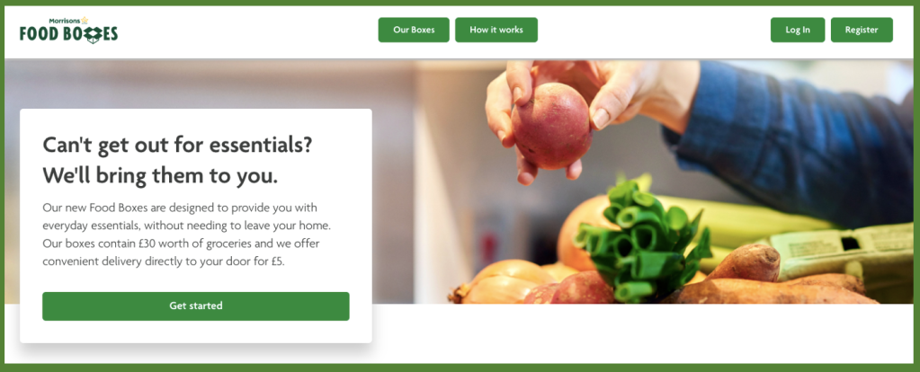 Morrisons, cleverly, has created a fixed-price food box delivered for £5. It is a simple, unique solution that solves the public’s primary need for grocery essentials to cover a period of isolation. It also addresses the challenge of fast fulfilment when stock levels are unpredictable as the selection is based on what is available.