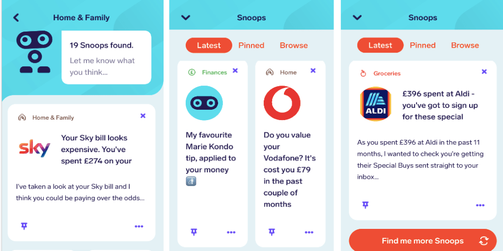 Snoop is therefore a challenge to comparison site brands which need to wait for consumers to find the motivation to visit for savings on a specific product / service. Once set-up Snoop doesn’t wait – it proactively engages and directs you to opportunities based on wherever you are spending your money.