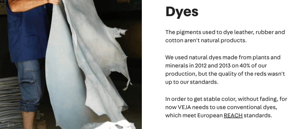 But where Veja have really pushed the pace is in the transparency of their sourcing and manufacturing. The company website explains each step of the production process with contracts or accreditations available to download and scrutinise. This goes further in a ‘limits’ section which explains the reason for any compromises on their sustainability goals. Of course, working closely with a small number of producers is easier than addressing a complex global supply chain. Nonetheless, Veja’s website represents a benchmark for consumer transparency for Nike and other established brands.