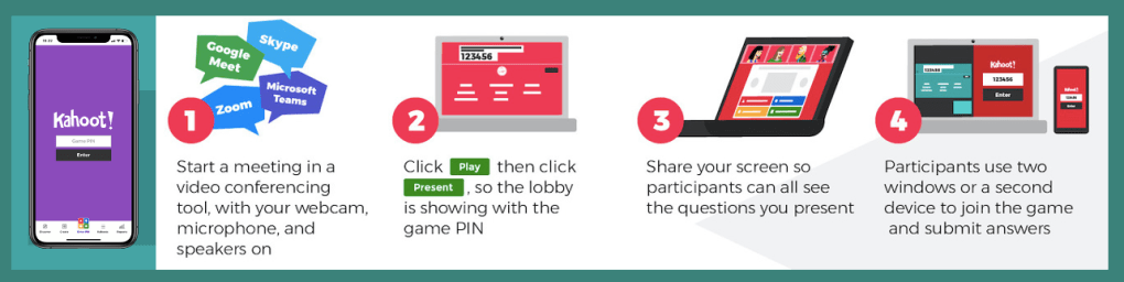 Kahoot quiz. This can be shared via Zoom or TEAMS to create a live all participant quiz. It is an ideal way to land some key information, highlight issues and foster some competitive motivation.