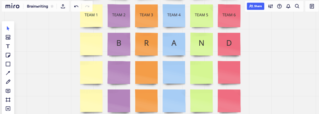Digital Post-it notes. Sites like Miro offer digital sticky notes which work for the capture of simple spontaneous ideas and builds. Have a look at the brain-writing board where you can arrange and colour code notes for each team or participant.