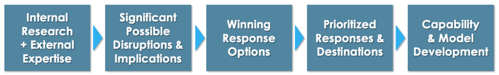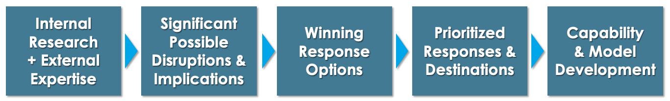 Our project objective was to determine the key business model and capability developments that would enable the division to become ‘future fit’ for the next 10 years. Our first step was to generate the most significant possible future disruptions facing the business. These disruptions served as a focus for identifying winning responses to accelerate / sustain growth. Prioritised responses then informed capability and model development choices to enable growth and build competitive advantage.