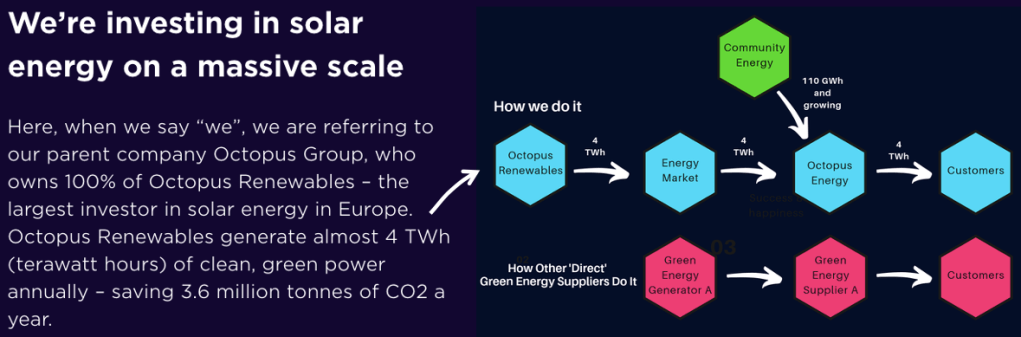 Cleverly, the energy ‘sold’ to UK domestic customers is predominantly that produced by sister company Octopus Renewables. Customers in the UK (at least for now) don’t get 100% green energy direct from Octopus. Instead they are purchasing a mix of green and dirty energy with Octopus producing the equivalent amount in renewable energy for the wholesale market. Octopus Renewables assets are benefiting investors and simultaneously attracting UK consumers looking for green energy.