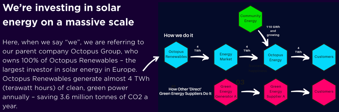 Cleverly, the energy ‘sold’ to UK domestic customers is predominantly that produced by sister company Octopus Renewables. Customers in the UK (at least for now) don’t get 100% green energy direct from Octopus. Instead they are purchasing a mix of green and dirty energy with Octopus producing the equivalent amount in renewable energy for the wholesale market. Octopus Renewables assets are benefiting investors and simultaneously attracting UK consumers looking for green energy.