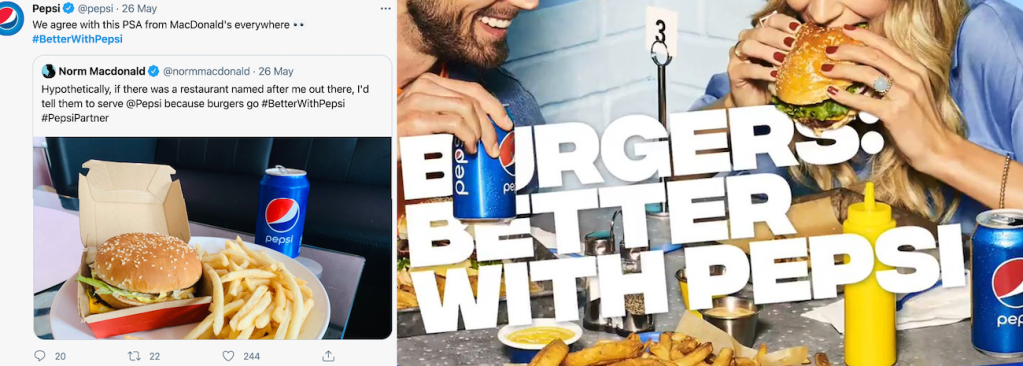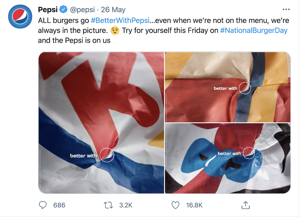Pepsi is working hard to attach their brand to popular fast food choices. The #BetterWithPepsi campaign is backed by a blind taste test claim that their fizzy drink goes better with Big Mac or Whopper burgers than rival Coca-Cola.