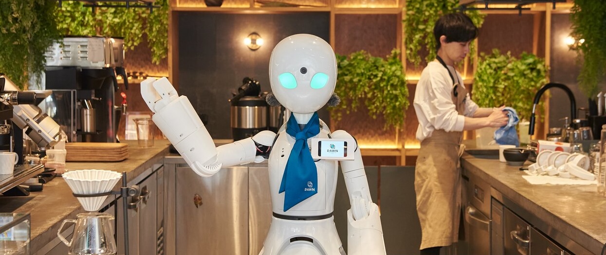 The Dawn Café where customers mix with robot staff suggests future possibilities for social care. Each of the robots is a physical avatar controlled by a human via phone, tablet or eye-tracking device from their own home or even hospital.