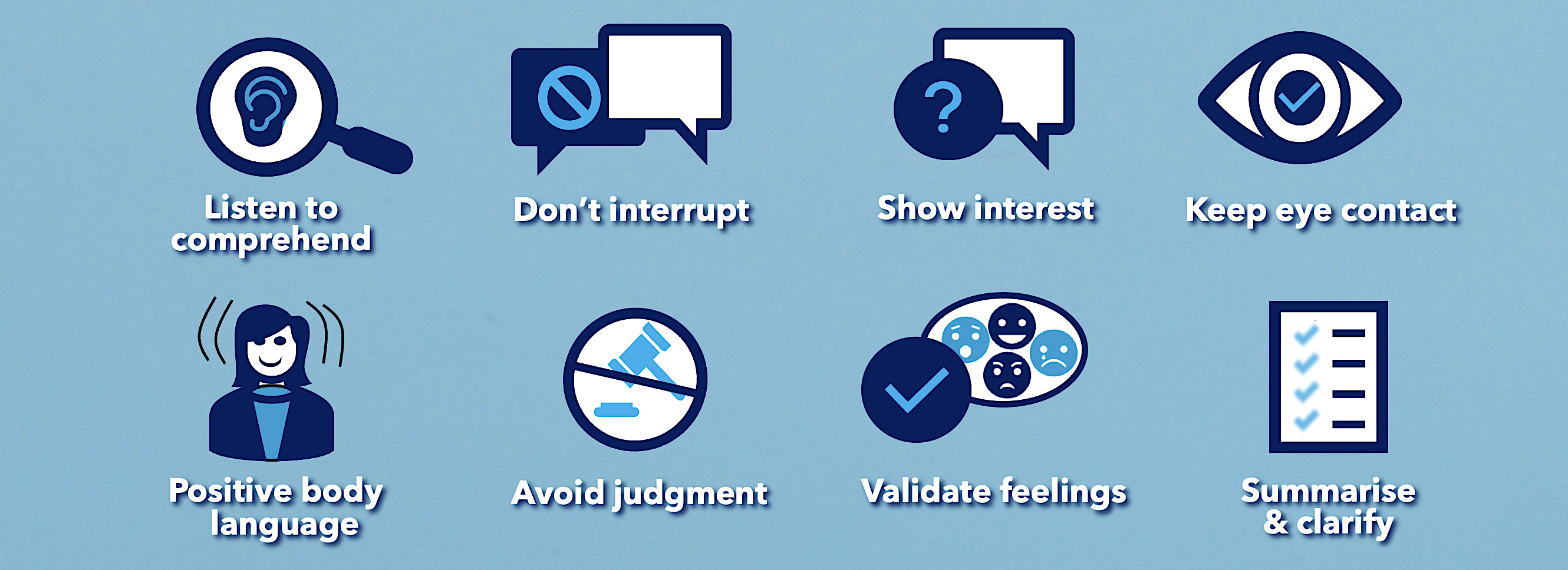 Identify opportunities to improve your listening. The checklist below may help you reflect on strengths and areas to improve. This short HBR video should highlight some gaps too. It makes good points on trampolining, orientating to needs, avoiding the inadvertent dismissing of concerns, and listening for comprehension (rather than validation).