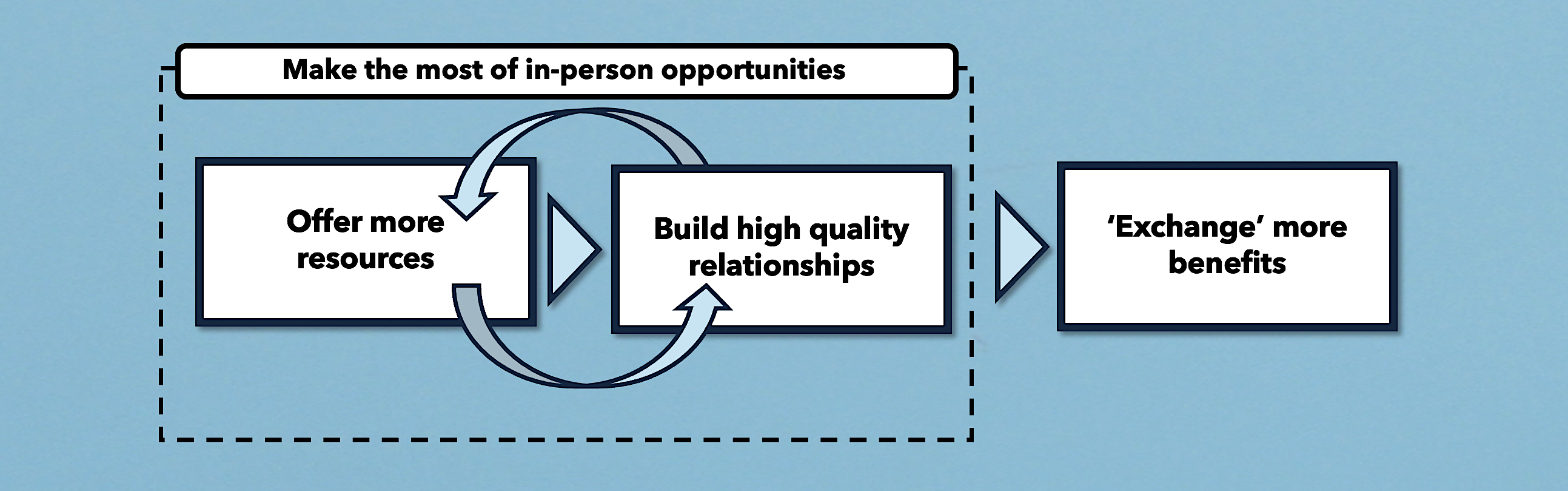 We are hard-wired to respond to in-person interaction and it appears we even employ distinct neuroprocessing pathways for live faces compared to those seen digitally. In-person interactions are consistently shown to outperform all virtual for positive affect and stronger / faster social connection. Being physically present supports a sense of trust and intimacy and a conversation that will flow more organically, allowing for deeper discussions and spontaneous reactions that promote connection. In-person opportunities makes it easier and quicker to build a quality relationship increasing scope to share and receive more resources. So, making the most of them matters.