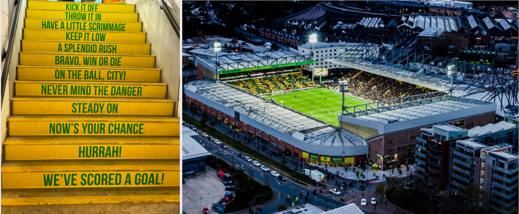 When Norwich City have a home game my cycle ride extends from Cathedral Close (above) via riverside walk to Carrow Road stadium. The football club has heritage too, claiming the oldest football ‘song’ in the world still in use. Dating back to at least 1902 you get a needed reminder of the words on the way to your seat. Away fans make it very clear they are not impressed by the chant which we embrace as jealously.